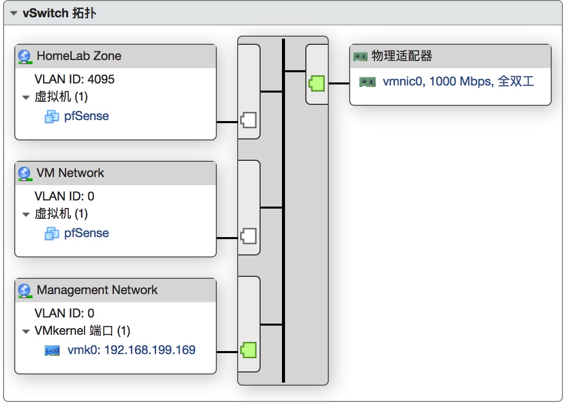 实际上这就是上面的第三种方式了,将VLan ID设置为4095之后,在虚拟交换这层做任何Vlan划分之后,都可以直接联通ID为4095区域下的虚拟机了(这里为pfSense),换到这里来说就是从家庭路由之后,先接入pfSense,再通过pfSense做规则来访问相对应的不同Vlan,这也就保证隔离了家庭路由与虚拟机直接的网络访问,能够很好的在家庭路由下(你自己的内网中)模拟内外网的情况。