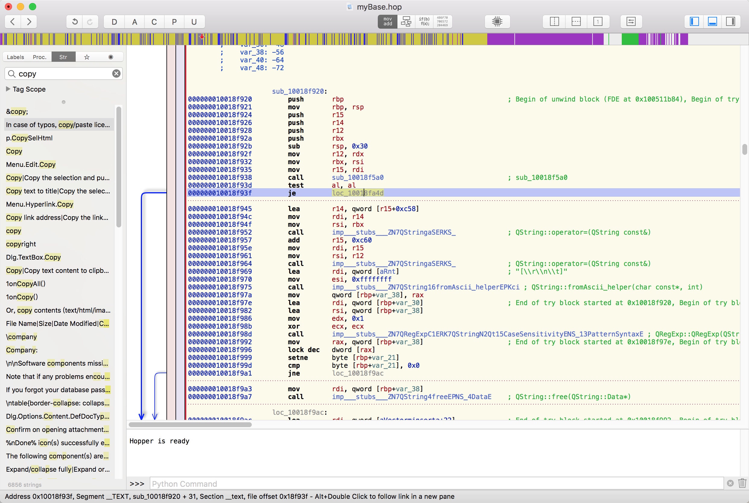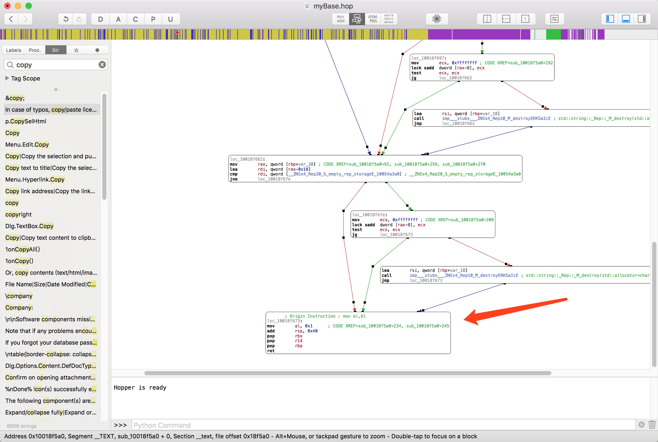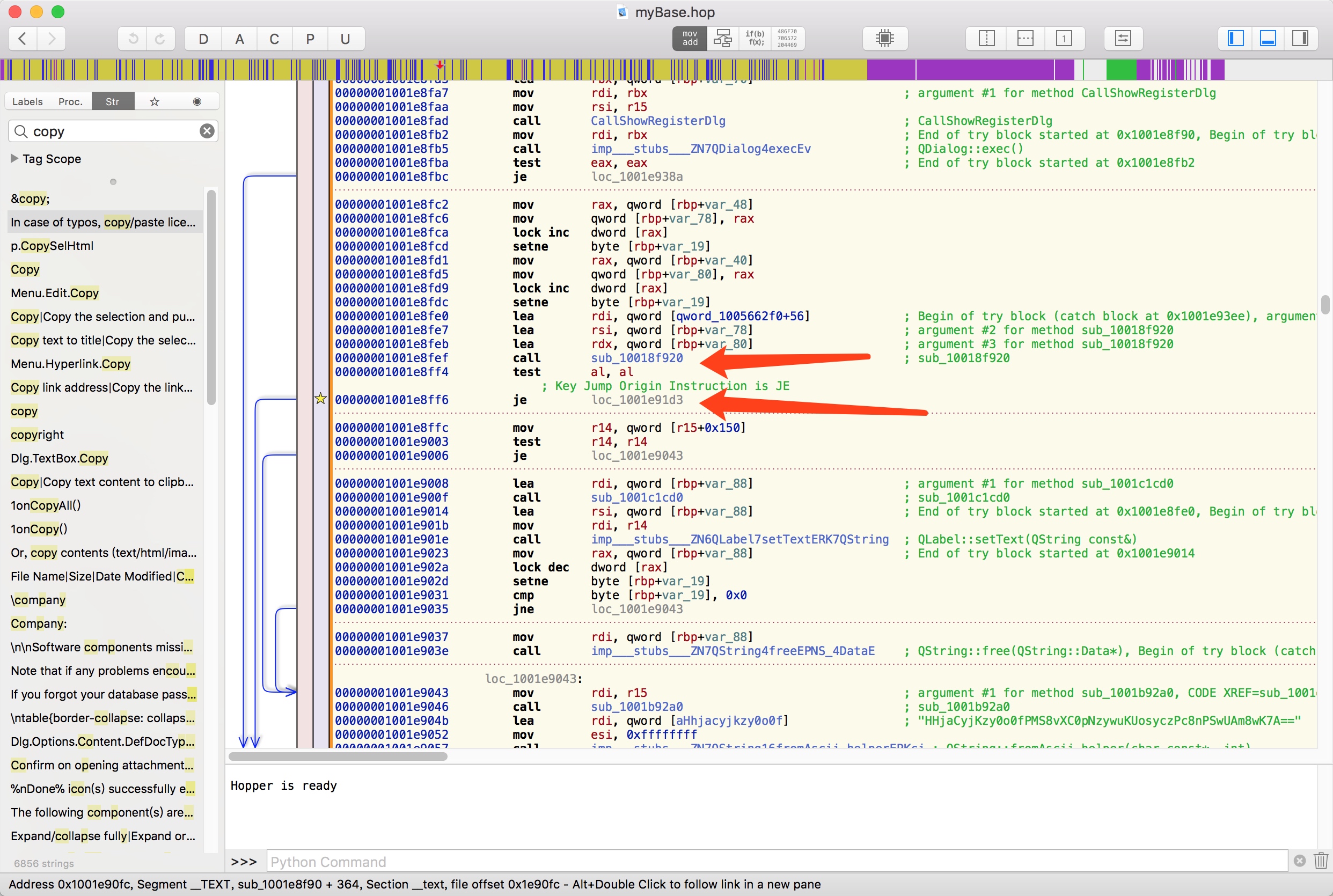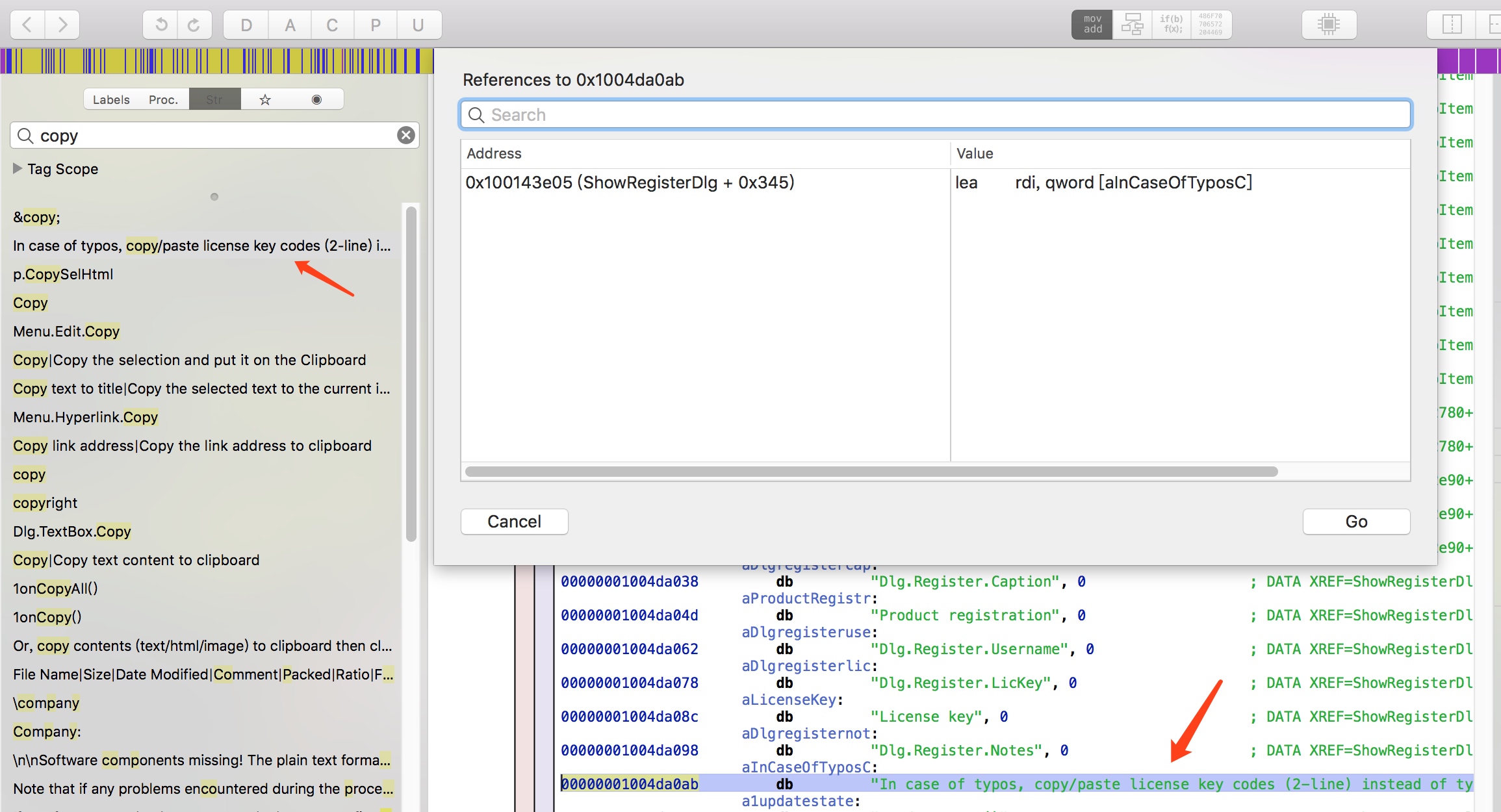祭出Hopper,选择直接读取二进制文件,找到 /Application/myBase.app/Content/MacOS/mybase 并加载,等待Hopper分析完之后就可以开始调试了。直接在Hopper的Str标签中搜索 invalid ,没有发现刚刚弹出的类似提示,继续搜索 license 也是几处无关痛痒的,但是刚刚提示中还有一句 In case of typos, copy/paste license key codes (2-line) instead of typing them manually. 我们直接搜索copy,同时可以在数据段中直接按x查找它的引用,如下图所示: