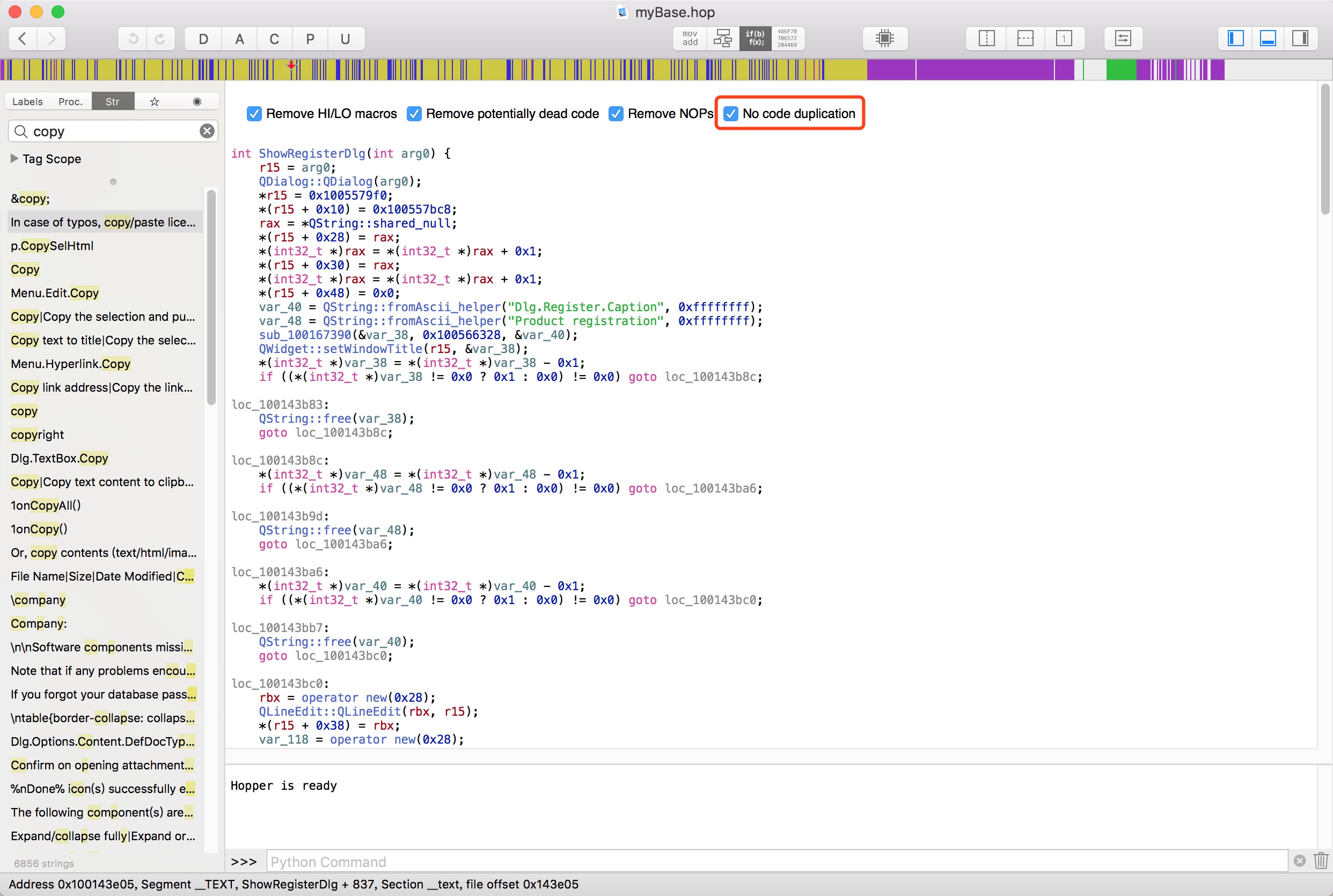 点进去引用之后,可以看到Hopper已经帮我们分析相关符号了,在注释中可以看到一些调用的名称,从这里可以看出mybase采用了Qt框架来开发。如果不习惯直接看反汇编代码的话,Hopper也提供了类似IDA的f5相同的功能,点击右上角的带有if字样图标即可,同时我建议勾选 no code dup 这个选项,这更符合我们看反汇编代码时的习惯,如下图所示: